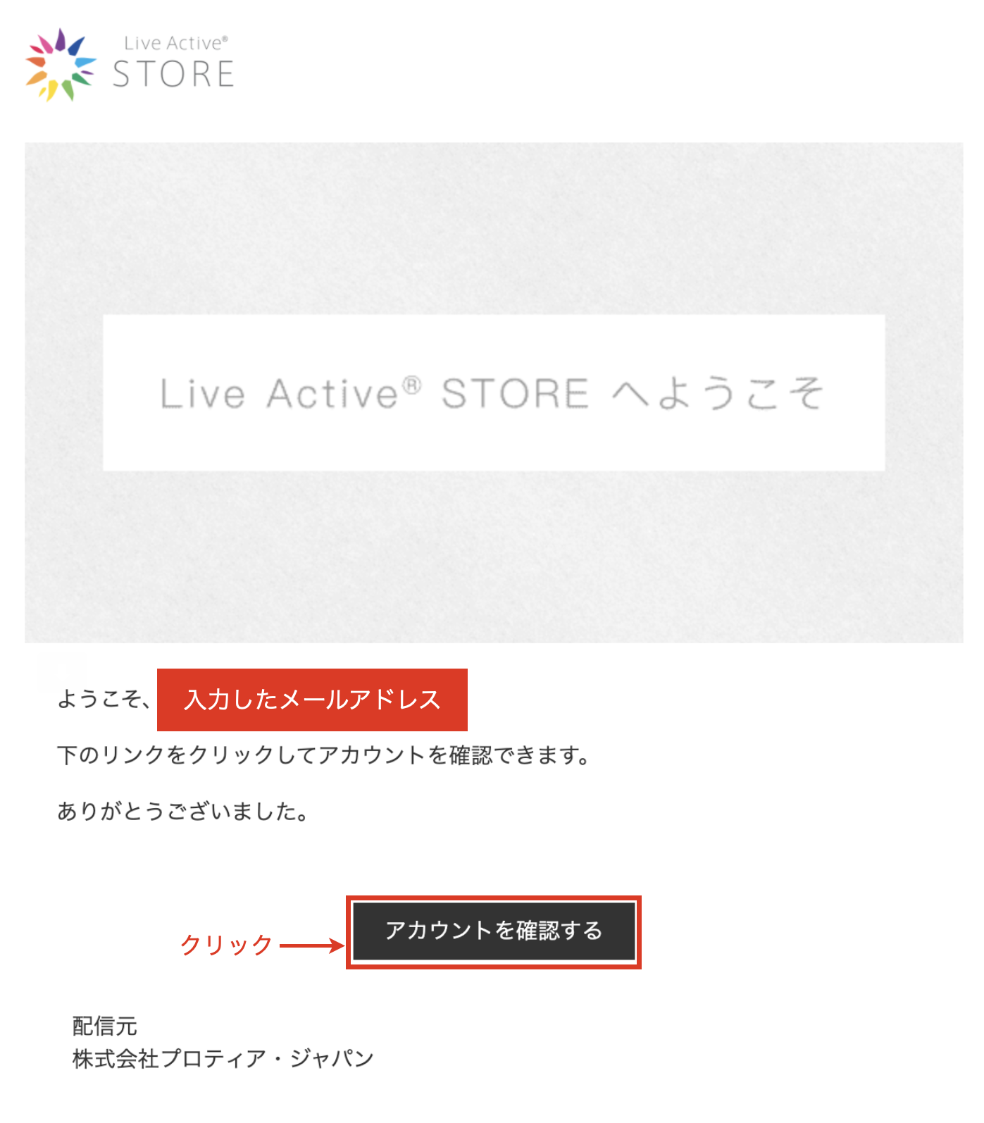 4、入力いただいたアドレスへメールが届きます。入力したアドレスが記載されているのをご確認いただき、「アカウントを確認する」をクリックお願い致します。