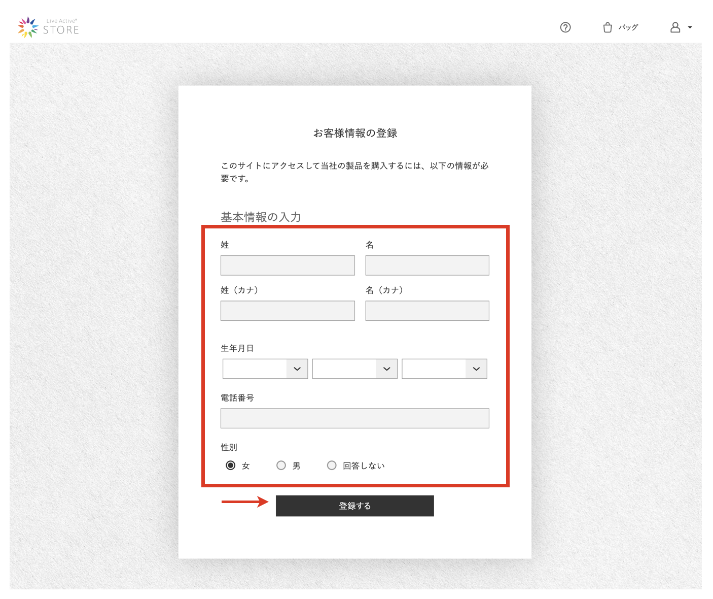 2、お客様のEメールアドレスを「Eメール」に入力いただき、下線部のLive Actives STORE利用規約、Live Activeプログラム規約、プライバシポリシーをクリックしていただき、お読みいただいた後に、ご同意いただいた上で、矢印の個人情報に同意するにチェックをして会員登録へ進むのボタンをクリックしてください。