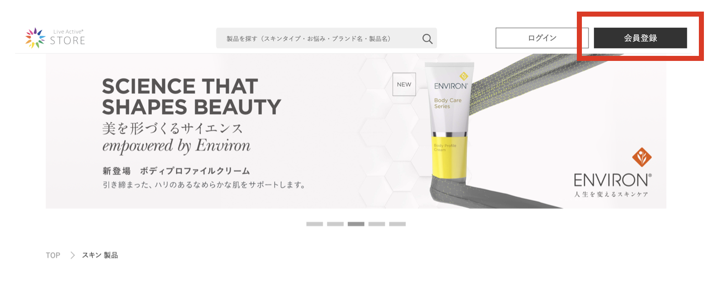 1、エンビロンの公式サイト【Live Active】にアクセスし、会員登録をクリック