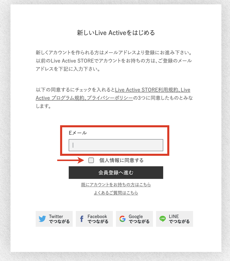 2、お客様のEメールアドレスを「Eメール」に入力いただき、下線部のLive Actives STORE利用規約、Live Activeプログラム規約、プライバシポリシーをクリックしていただき、お読みいただいた後に、ご同意いただいた上で、矢印の個人情報に同意するにチェックをして会員登録へ進むのボタンをクリックしてください。
