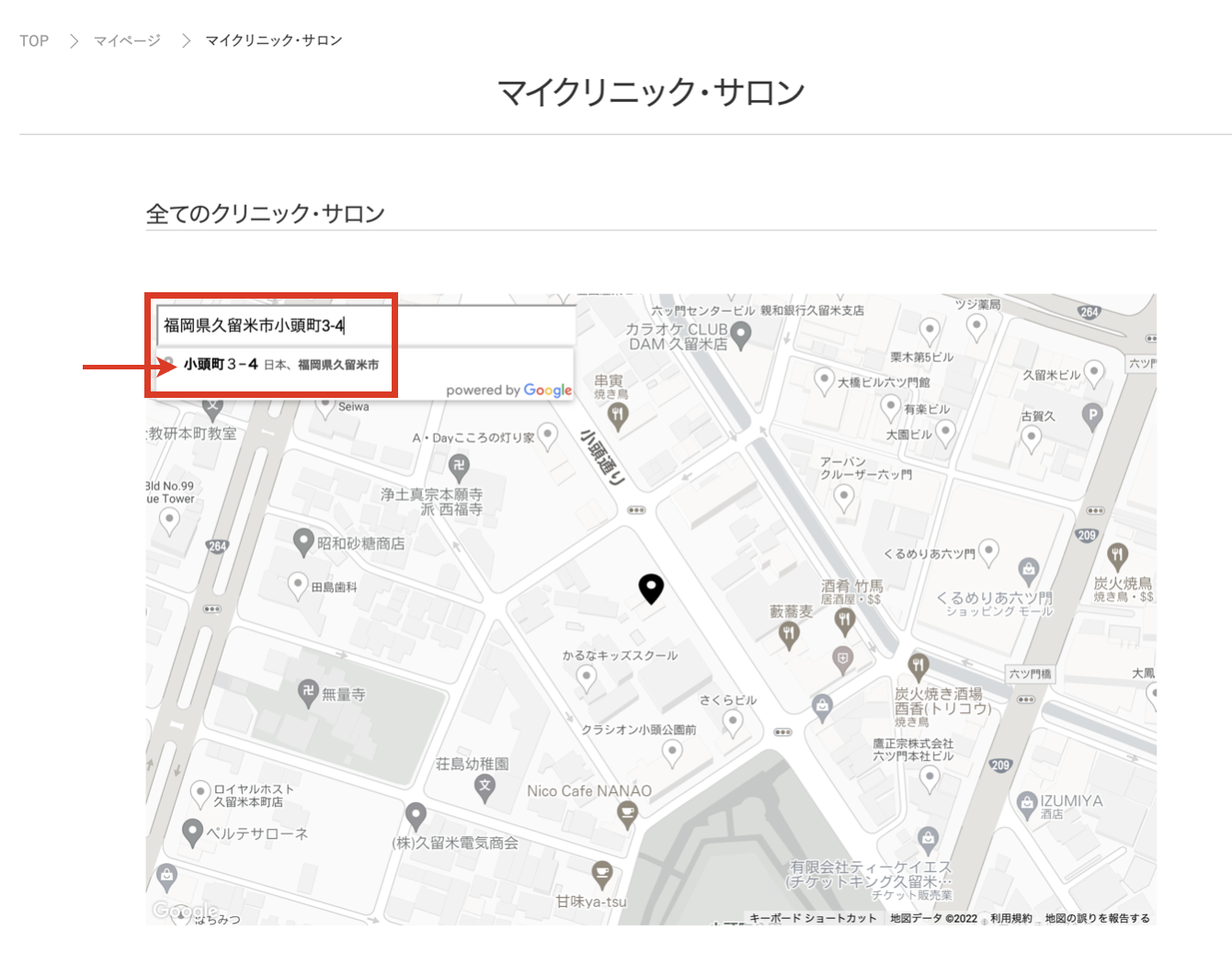 9、地図のページの検索窓に、当店の住所を入れて、下に出てきた住所をクリックしてください。